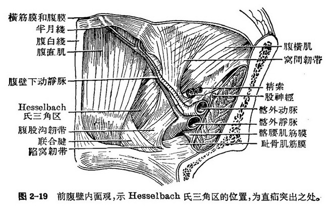 腹股沟管和直疝三角是人体两个重要的解剖部位。 (1)腹股沟管:腹股沟管是位于人体下腹前壁,腹股沟韧带的内上方,即人的“大腿根部”的一个管状结构。成年人的腹股沟管长4——5cm,走行的方向由外向内,由上向下,由体表深部向体表浅部斜行。