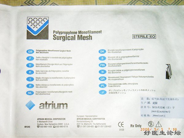 巴德公司生产的BardMesh Composix 疝修补片,是由2 层聚丙烯补片和1 层膨化聚四氟乙烯构成。集合了2 种材料的优点,更多地克服了材料的不足之处,这种材料尤其适合腹腔镜腹腔内切口疝修补。德国生产并广泛使用的钛包被疝修补材料,具有重量轻, 透明,长期稳定性好,组织相溶性好,避免了其他材料引起局部血清肿,感染,移植物对局部器官组织的刺激,避免了植入物周围的慢性纤维化,以及由此引起的复发和慢性疼痛。
